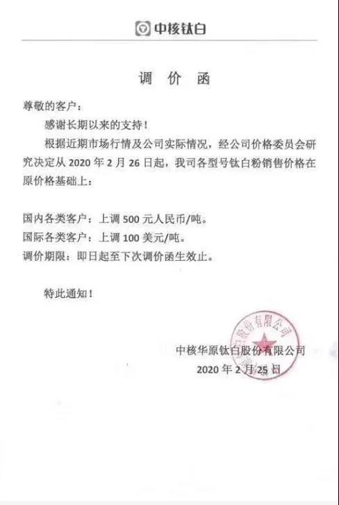 下游客户陆续复工,钛白粉采购潮将开启,涨价将无法避免。2月25日,中核华原钛白股份公司发布调价函通知,根据目前市场及实际情况,经公司价格委员会研究决定从2020年2月26日起,调整公司各个型号钛白粉市场价格。对国内各类型客户在对应价格上上调500元/吨,对国际各类型客户上调100美元/吨。
