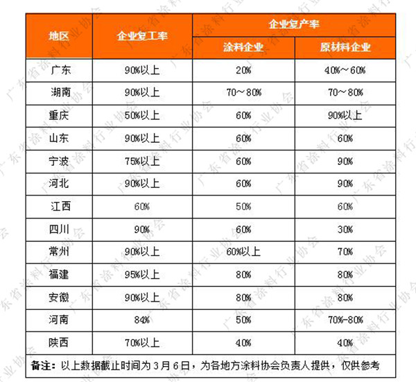 进入3月份以来,广大涂料企业在做好防疫、确保疫情不扩散的前提下,投入到开足马力保生产、保市场的行动中。从区域来看,除了河南、重庆等疫情重灾区外,其他各地区的复工率相对2月份来说,在全面的提升。从实际复工率来看,各地涂料原材料企业的复工率普遍要高于成品企业,这对于涂料企业复工复产、稳定原材料价格注入一针强心剂。