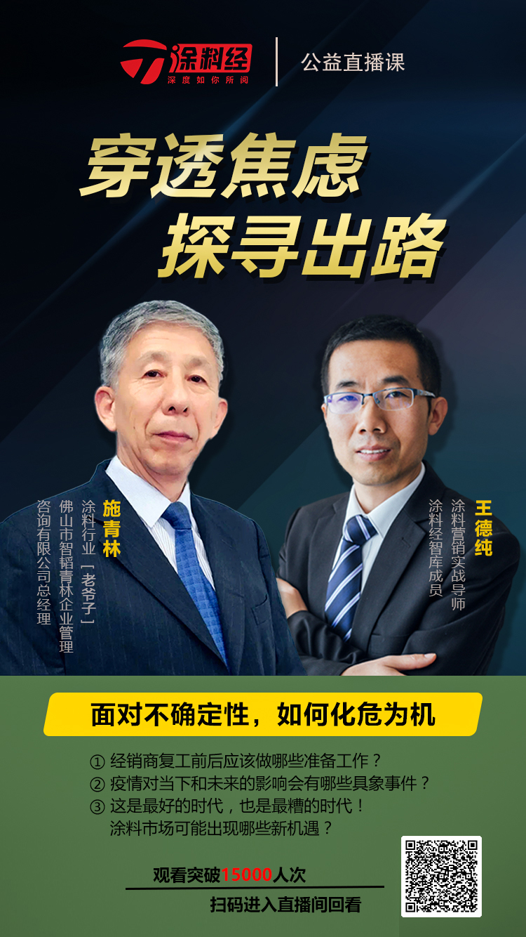 3月3日,《涂料经》首场直播课《穿透焦虑,探寻出路》——涂料渠道当前所面临的“危”与“机”圆满落幕后,在经销商的期待下《涂料经》第二场直播课《穿透焦虑,探寻出路》——“面对不确定性,如何化危为机?”于3月8日下午3时准时开播,让涂料人更好地穿透焦虑。(可以扫描下文海报或者点击“阅读原文”可进行回看)