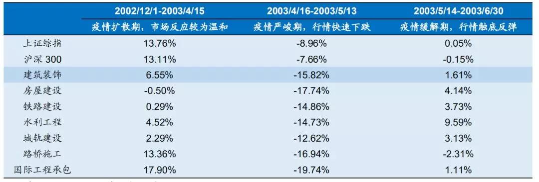 建筑材料行业是典型的劳动密集型产业,在非典爆发的中后期,受疫情影响较为明显。同时建筑板块本就弹性较大,在第二、第三阶段的涨跌幅均超过众多行业,第二阶段跌幅更是在28个子行业中位居第二。