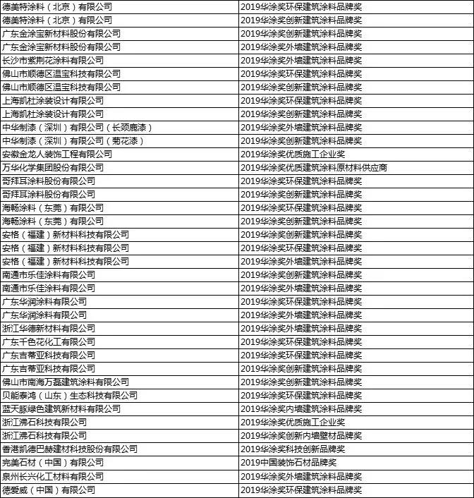 为加快实施特色发展、高端发展,更好的推动制造业向更加健康文明的方向发展,引领绿色家居装饰装修材料生产和应用,全面提升家居装饰装修材料质量和安全性能,规范行业管理,12月20日,2019年“第三届中国全装修家居产业峰会”在佛山隆重召开。在会议进行的第六届建筑涂料行业“华涂奖”表彰大会上,揭晓了第六届华涂奖获奖企业名单,金涂宝、紫荆花、中华制漆、华润等多家涂企获“环保建筑涂料品牌奖”和“外墙建筑涂料品牌奖”等。