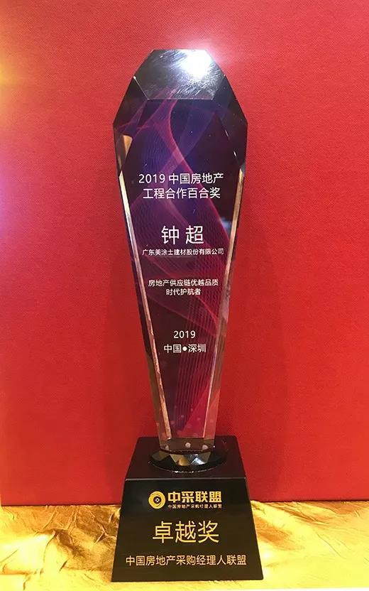 2019年12月26日,第六届中国房地产供需合作发展年会在深圳举行,美涂士集团副总裁工程事业部总经理钟超受邀出席。在颁奖环节中,美涂士囊获工程合作百合奖“最佳诚信服务供应商”,美涂士集团副总裁钟超荣获2019中国房地产工程销售“卓越奖”。