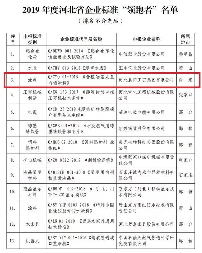 1、晨阳水漆进入河北省企业标准“领跑者”名单