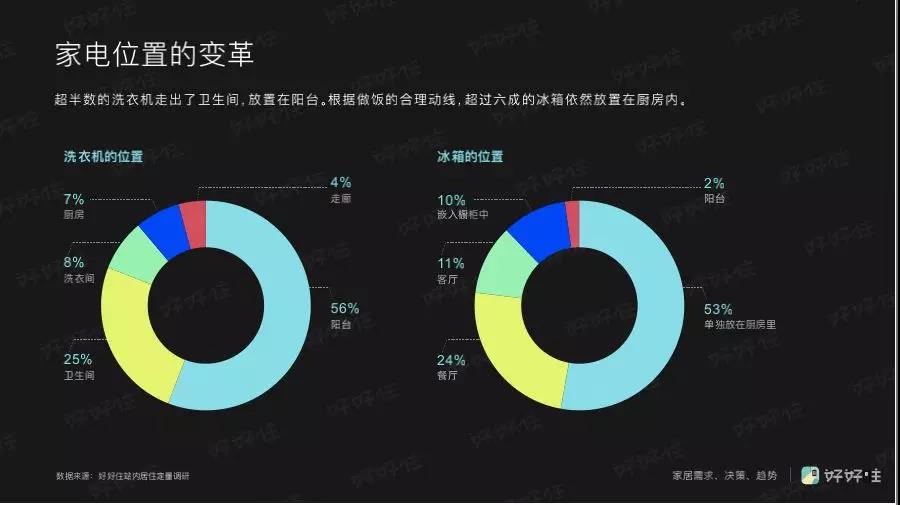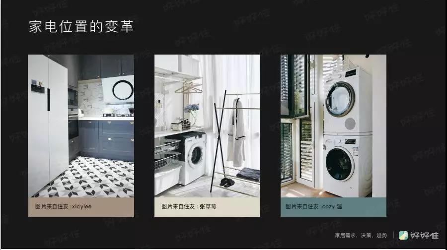 超半数的洗衣机走出卫生间、进到阳台,当属家电位置的最大变革。“好好住App里,用户在阳台打造了各式洗衣区,比如洗衣收纳柜,以及集洗衣、晾晒、烘干、熨干于一体的洗衣房等”,好好住家居研究院首席分析师洪杉谈到。