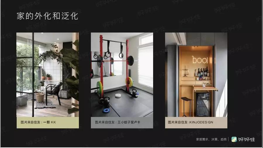 如右图,从左至右依次为家中工位、家中健身房、家中小酒吧,图片案例均来自好好住App。