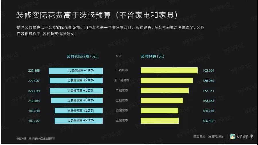 装修实际花费高出装修预算24%。正所谓“装修预算就是拿来超的”,纵观全国家装市场,消费者的装修实际花费平均高出装修预算24%。“因为装修是一件极为复杂且冗长的过程,装修过程中,各种超支情况频发”,好好住家居研究院院长吴偌萌谈到。