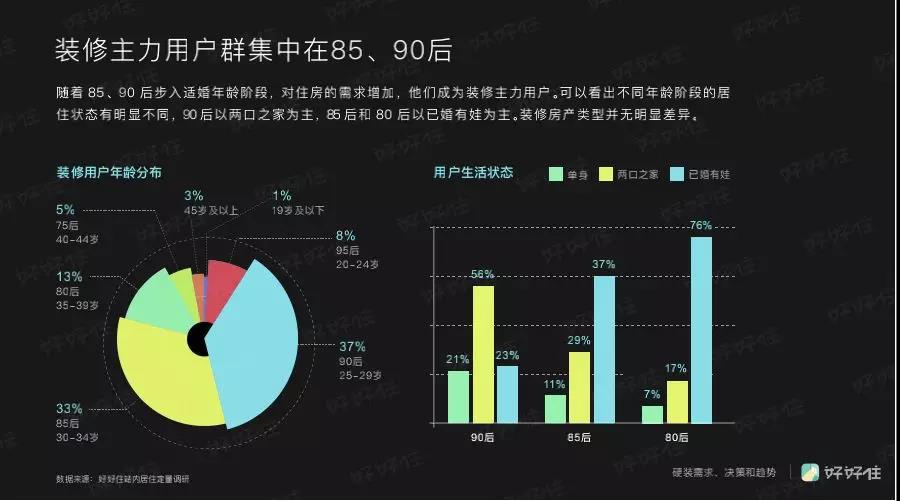 装修主力军集中在85、90后。随着85、90后逐渐步入适婚年龄,对住房需求大大增加,也成了家装消费主力军。相比上一代,面对居住,他们更愿为「品质装修」买单。