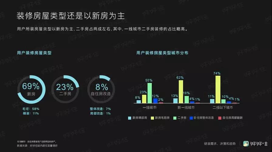 装修房屋类型以新房为主,「半包」为主要装修方式。就全国市场而言,装修房屋类型以新房为主。但目前,一线城市仍以二手房装修为主。