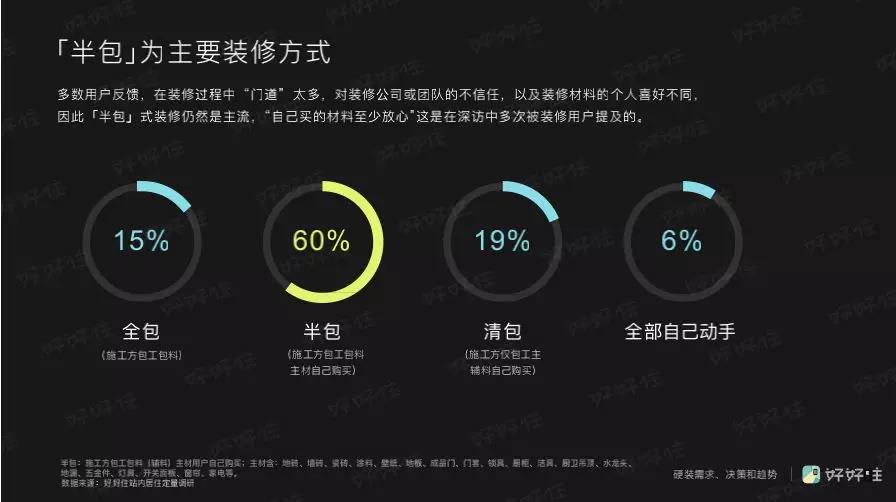 「半包」是目前主流装修方式(半包式装修,是指施工方负责施工和辅料,而价值较高的主料,如地板、洁具、瓷砖、涂料等由消费者自行采购)。其中,装修请设计师的消费者也可以选择「半包」式装修。这样一来,设计师主管施工,消费者则掌握决策大权。