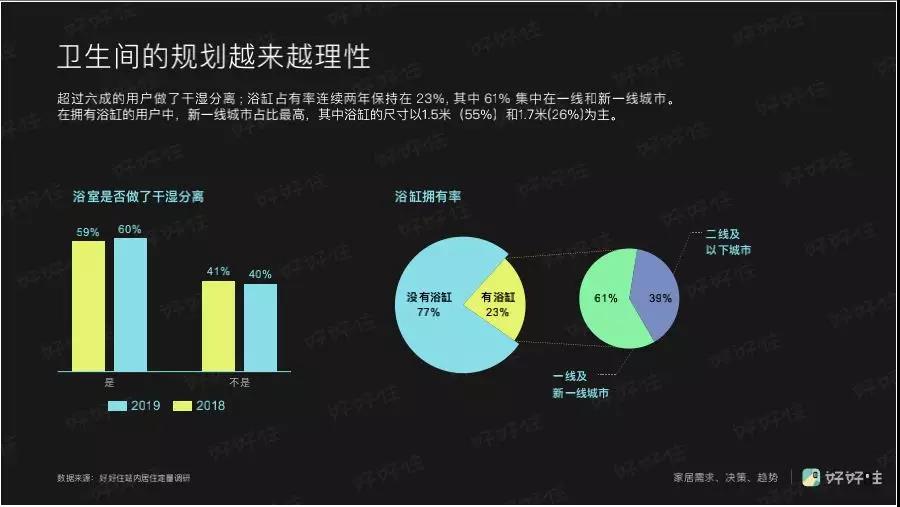 与此同时,超六成用户在卫生间做了干湿分离,这也反映都市人对卫生间的规划更趋理性。“有条件的家庭,甚至把家里做成了三分离、四分离,即马桶、干区以及淋浴区的区隔”,好好住家居研究院首席分析师洪杉补充道。
