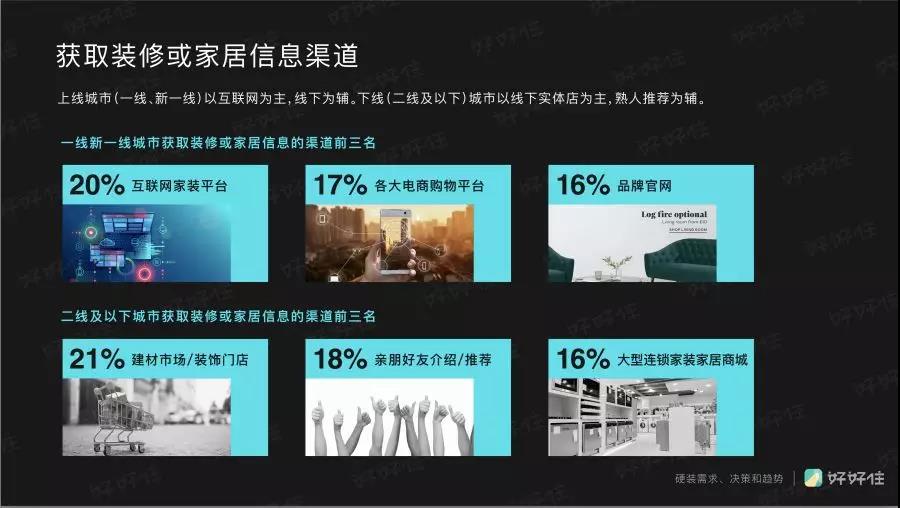 如图,一线新一线城市获取装修或家居渠道中,互联网家居平台占比最大,其次为各大电商购物平台与品牌官网。