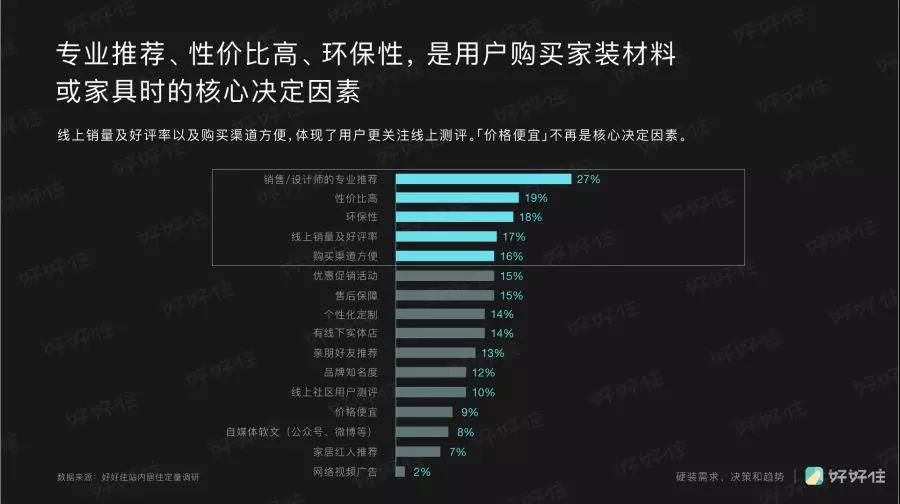家居家装的具体决策因素中,消费者最看中设计师(或销售)的专业推荐。以家装为例,它本身就是一件专业度、复杂度极高的事。“一旦消费者装修时请了设计师,他的忠诚度是很高的。一位设计师甚至可以在5、6个月的装修过程中,决定一位消费者20万至30万的消费预算”,冯表示。