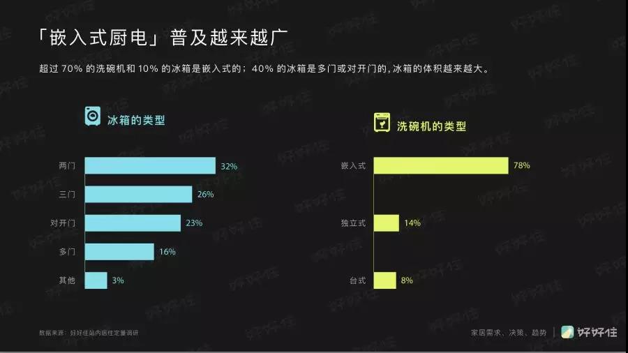 在厨电的选择上,嵌入式厨电越来越普及。其中,嵌入式洗碗机占比高达78%。在传统双开门、三开门冰箱外,近半数用户开始选择对开门、多门冰箱等。