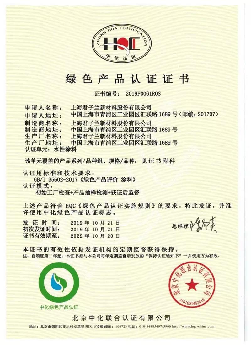 2019年11月,经过专家组的严格评审,君子兰涂料集团的水性涂料、UV固化涂料已经顺利通过绿色产品认证。