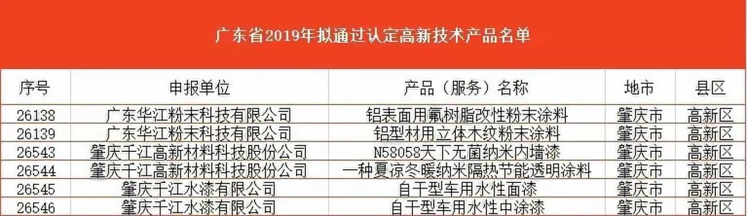 根据上图所示,千江此次入选产品分别为:广东华江粉末科技有限公司铝表面用氟树脂改性粉末涂料、铝型材用立体木纹粉末涂料;肇庆千江水漆有限公司自干型车用水性面漆、自干型车用水性中涂漆;肇庆千江高新材料科技股份有限公司N58058天下无菌纳米内墙漆、一种夏凉冬暖纳米隔热节能透明涂料。