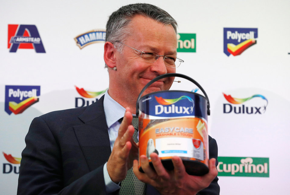 阿克苏诺贝尔现任CEO范迪睿在英国阿兴顿新涂料工厂开幕式上展示Dulux产品。阿克苏诺贝尔通过收购ICI继承了正统的Dulux品牌