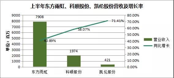 2019年1-6月东方雨虹、科顺股份、凯伦股份营收及增长率(数据来源:企业年中报)