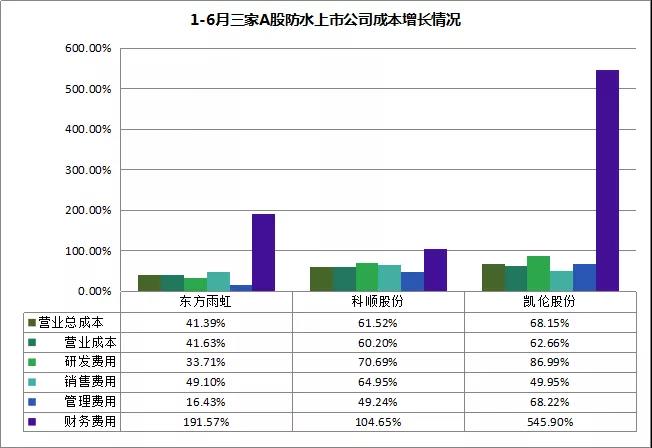 从数据看,1-6月,三家A股上市公司营业收入和营业成本增长基本相等,其中科顺股份及凯伦股份营业总成本增速均超过了50%,不过两家企业最大的增速均来自研发费用的增加。而在财务费用板块,凯伦股份一绝红尘,主要系有息负债增加所致。