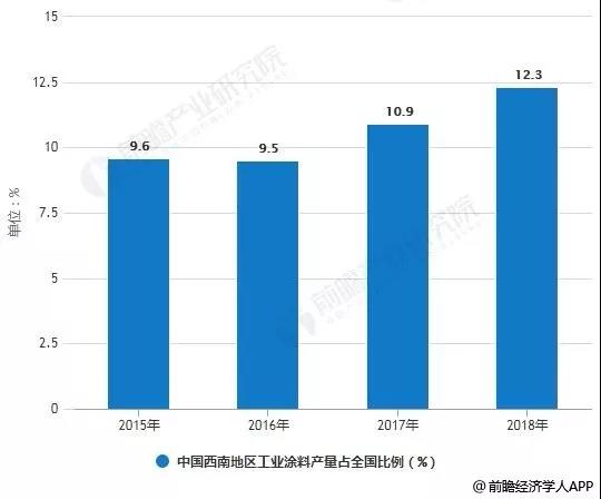 西部开发、产业区域结构战略调整导致了西南地区工业涂料产量占比快速提升,从2015年的9.6%上升至2018年的12.3%,重庆、四川工业涂料产量迅速增长,成为涂料大省,辐射整个大西南地区。未来几年,随“一带一路”政策及西部开发政策推进,西南地区工业涂料市场仍将保持较高速度增长,可重点关注。