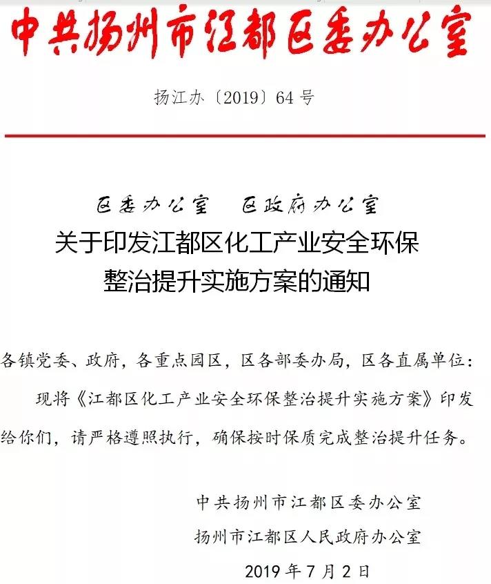 根据了解,7月2日中共扬州市江都区委办公室发布了《关于印发江都区化工产业安全环保整治提升实施方案的通知》称:对规模以下企业进一步摸底排查,根据《省方案》中压减园区外化工生产企业数量、压减规模以下化工生产企业数量,淘汰安全风险高、环保管理水平差和技术水平低的化工生产企业等要求,以及区委区政府针对化工生产企业“分布散、规模小、污染重、风险大”等问题向省纪委作出的整改承诺,对安全和环保不达标的企业,2020年底前全部关闭退出,达标的企业鼓励进入化工园区(集中区)发展。