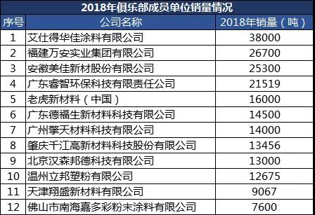 目前粉末涂料制造业企业俱乐部十二家成员单位2018年的粉末涂料总销量为 211817吨,占2018年粉末涂料百强企业总销量的25%。这十二家粉末涂料企业的联合,将会对整个粉末涂料行业起到很大的推动作用,将整个粉末涂料行业的核心力量聚在一起,以便以最直接的方式探讨粉末涂料行业的发展趋势,以达到抱团取暖的作用。