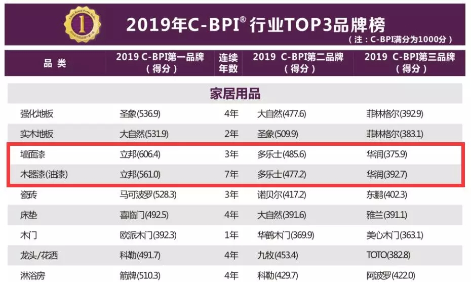 据《涂料经》观察,2019年中国品牌力指数有关涂料的有墙面漆和木器漆(油漆)两大类,前三甲均为立邦,多乐士,华润三大品牌。其中立邦墙面漆以C-BPI指数606.4分(2018年为627.1分)连续三年夺得第一墙面漆品牌;而立邦木器漆(油漆)以C-BPI指数561.0分(2018年为570.8分)第七年夺得第一木器漆品牌。