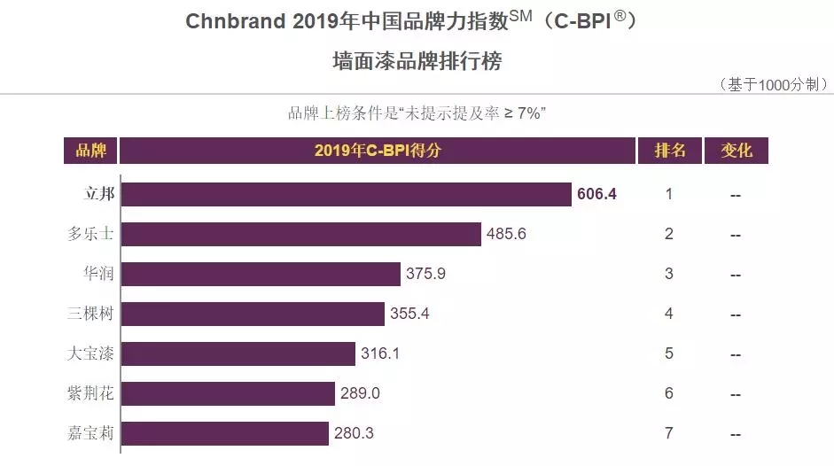 由工信部科技司和消费品司指导,品牌评级机构Chnbrand推出的2019年中国品牌力指数于15日发布。指数报告对近8千个中外品牌进行了总体评价和分析解读。其中,立邦、多乐士、华润、三棵树、大宝漆、嘉宝莉、紫荆花等知名涂料品牌上榜。