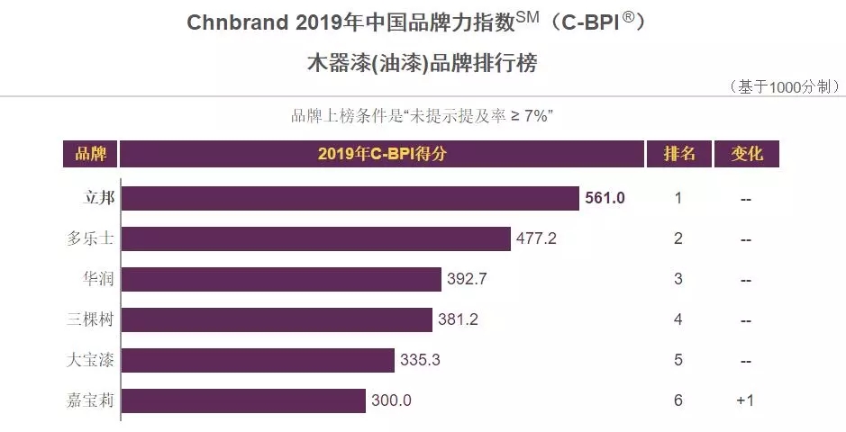 细分指标木器漆(油漆)品牌排行榜显示,立邦、多乐士、华润、三棵树、大宝漆、嘉宝莉,C-BPI得分分别为561.0、477.2、392.7、381.2、335.3、300.0,分别排名第1-6位。去年上榜的樱花、长颈鹿,今年则退出榜单。(品牌上榜条件是“为提及提及率≥7%”)