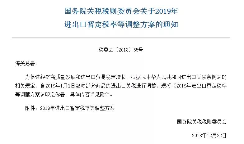 12月24日,财政部网站发布了《国务院关税税则委员会关于2019年进出口暂定税率等调整方案的通知》。经国务院关税税则委员会审议通过,并报国务院批准,