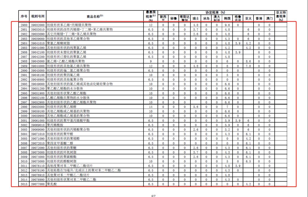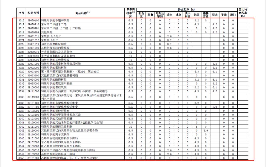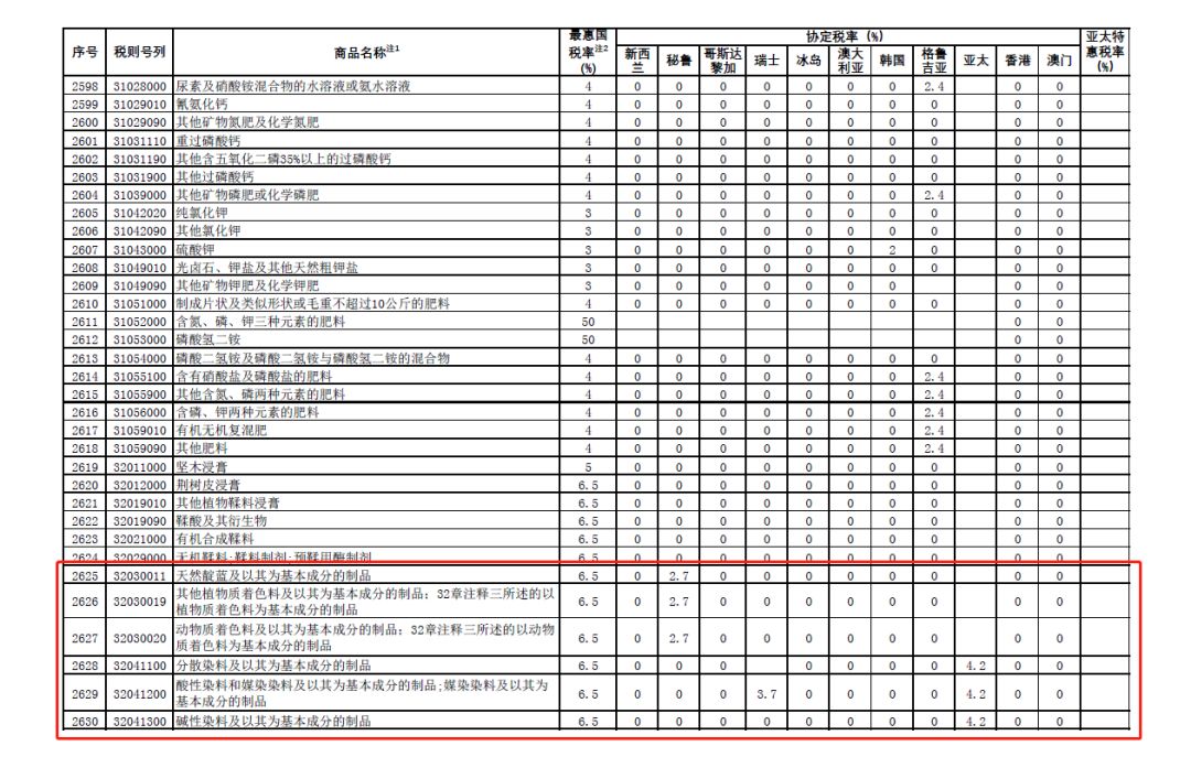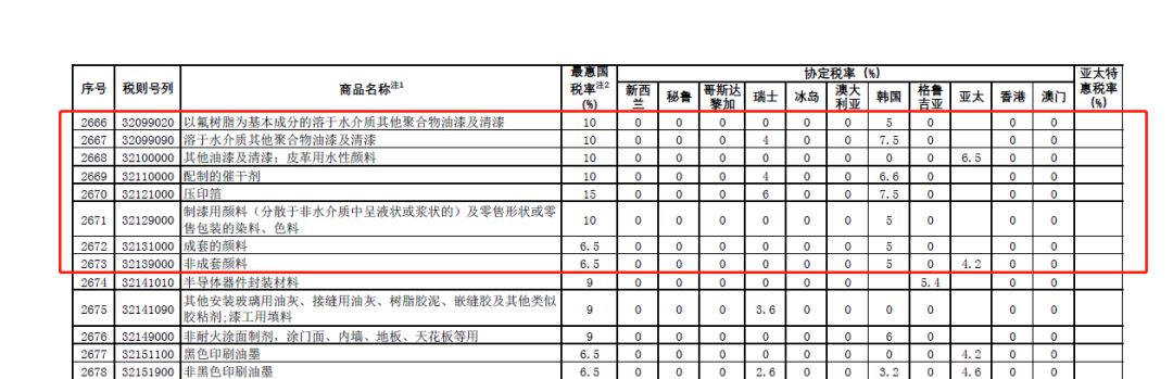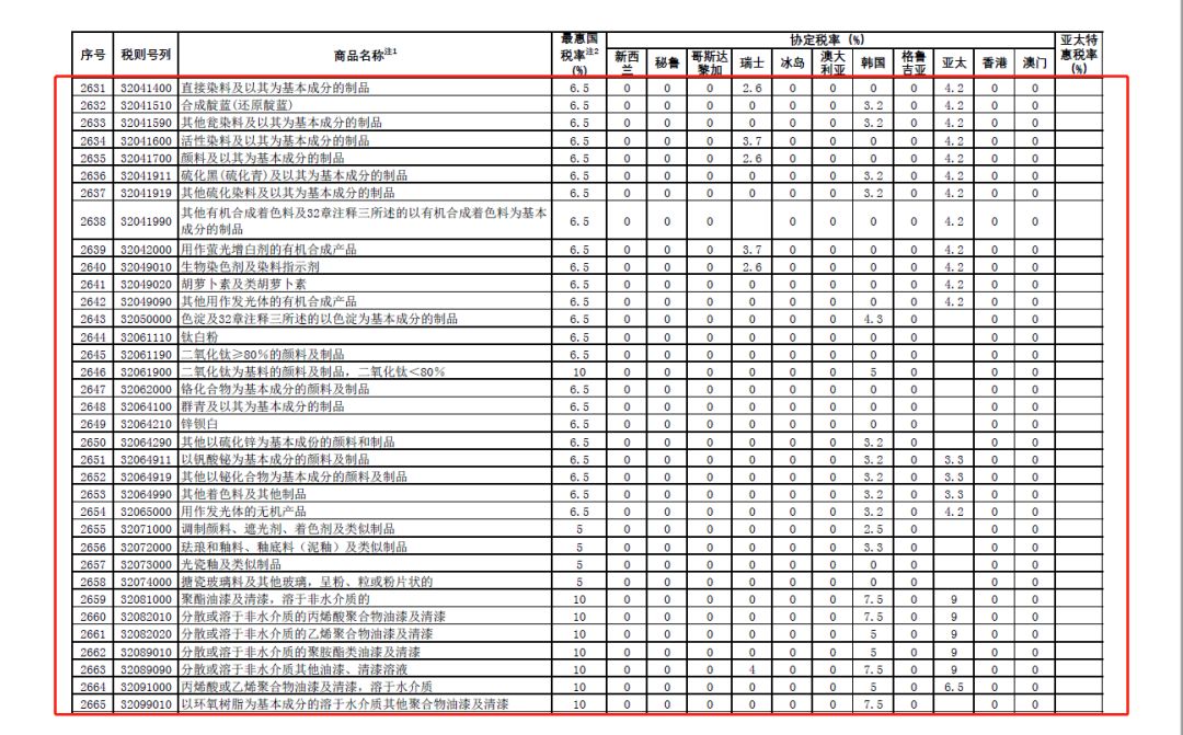 其中近百项进口货物对新西兰、秘鲁、冰岛、澳大利亚、香港、澳门等地实施零关税,对瑞士、韩国及亚太贸易协定国家实施最高不超过10%的低进口关税,包括部分涂料上下游产品,详见下图。