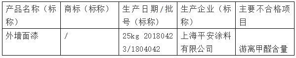 本次抽查发现,上海平安涂料有限公司生产(标称)的1批次外墙面漆(25kg 20180423/1804042)样品游离甲醛含量项目不合格。