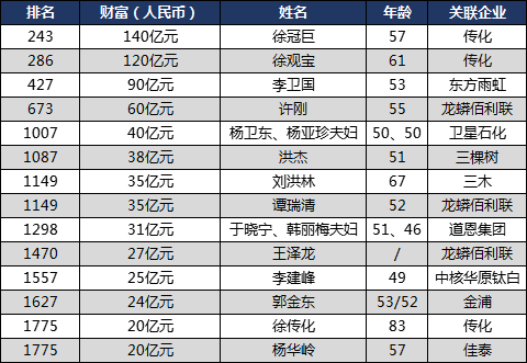 《涂料经》记者梳理发现,全国有14名涉足涂料领域的企业家进入“2018胡润百富榜”。其中,涂料行业共有3位,钛白粉行业有6位,树脂行业1位;其它原材料领域共计1位。涂料行业分别是东方雨虹的李卫国(427名,90亿元)、三棵树涂料的洪杰(1087名,38亿元)、佳泰集团的杨华岭(1775名,20亿元);钛白粉行业分别是龙蟒佰利联的许刚(673名,60亿元)、谭瑞清(1149名,35亿元)、王泽龙(1470名,27亿元),道恩集团的于晓宁(1298名,31亿元)、韩丽梅夫妇(1298名。31亿元),中核华原的李建锋(1557名,25亿元),金浦钛业的郭金东(1627名,24亿元)。