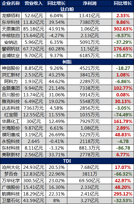 根据上图,我们可以得知,在钛白粉企业中,57%的企业净利润同比增长,涨幅最高可达302.63%,其中金浦钛业净利润同比下降35.87%;在树脂企业中,57%的企业净利润同比增长,涨幅最高可达161.79%,其中红宝丽净利润同比下降74.79%;在TDI企业中,66%的企业净利润同比增长,涨幅最高可达295.12%,其中梦百合净利润同比下降66.32%。