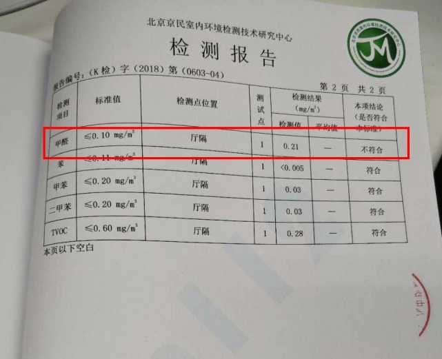 机构的检测报告显示,陈航的房间甲醛超标2.1倍。