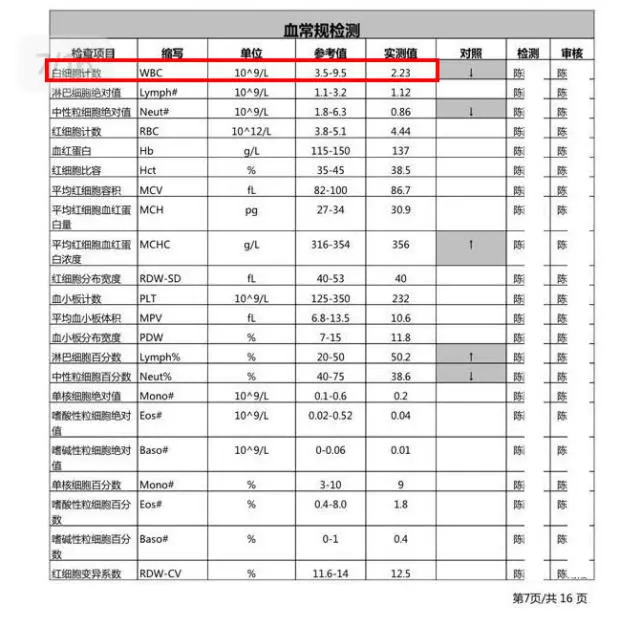 7月6日的体检报告显示,刘雅体内白细胞的检测值仅为2.23。