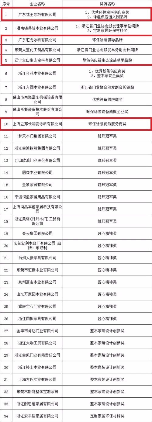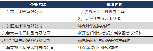此外,峰会期间还对绿色产业链的优秀企业进行了颁奖,其中广东花王涂料有限公司荣获“优秀环保涂料供应商奖”以及“绿色供应链入围品牌”;广东汇龙涂料有限公司荣获“环保涂装倡导品牌”;东莞大宝化工制品有限公司荣获“浙江省门业协会颁发常务副会长铜牌”;辽宁宝山生态涂料有限公司荣获“绿色供应链生态涂装领军品牌”;上海立邦长润发涂料有限公司荣获“环保涂装优秀服务商奖”。