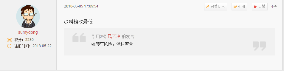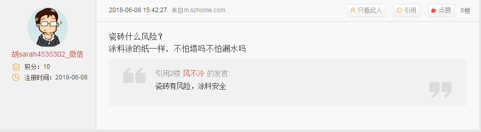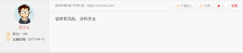 对于,网友纷纷发表了自己的意见,主要分为“涂料派”、“瓷砖派”两大阵营。其中“涂料派”网友表示,“瓷砖有风险,涂料安全”,而“瓷砖派”则反驳称,“涂料档次最低”、“瓷砖什么风险?涂料涂的纸一样,不怕塌吗不怕漏水吗”。