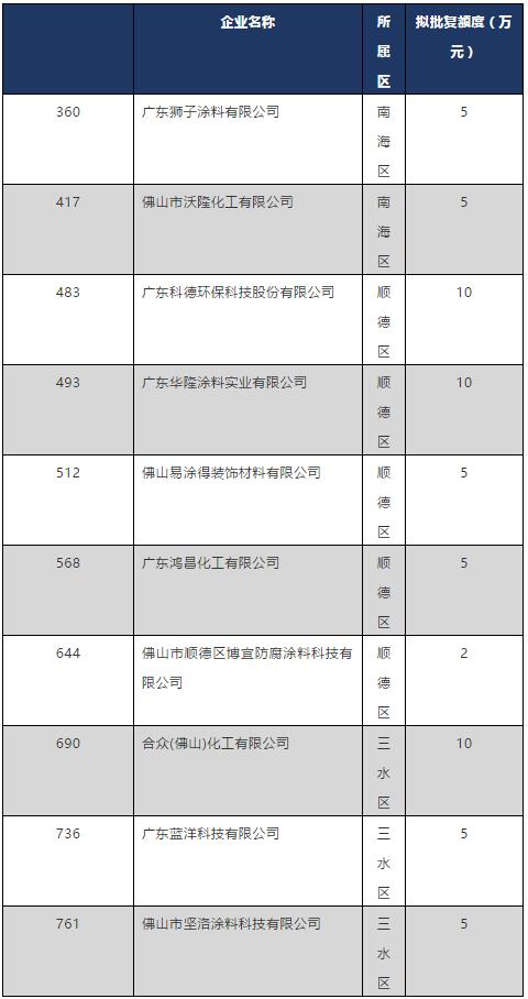 分别为广东狮子涂料有限公司(5万元)、佛山市沃隆化工有限公司(5万元)、广东科德环保科技股份有限公司(10万元)、广东华隆涂料实业有限公司(10万元)、佛山易涂得装饰材料有限公司(5万元)、广东鸿昌化工有限公司(5万元)、佛山市顺德区博宜防腐涂料科技有限公司(2万元)、合众(佛山)化工有限公司(10万元)、广东蓝洋科技有限公司(5万元)、佛山市坚洛涂料科技有限公司(5万元)。