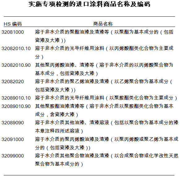 公告提出,《进口涂料备案书》在有效期内的进口涂料备案申请人应及时向所在地海关提出申请,于2018年7月1日前完成《进口涂料备案书》换发。据公告,海关将对溶于非水介质的聚酯油漆及清漆、溶于非水介质的光导纤维用涂料等9项进口涂料产品实施专项检测。本公告内容自发布之日起施行。