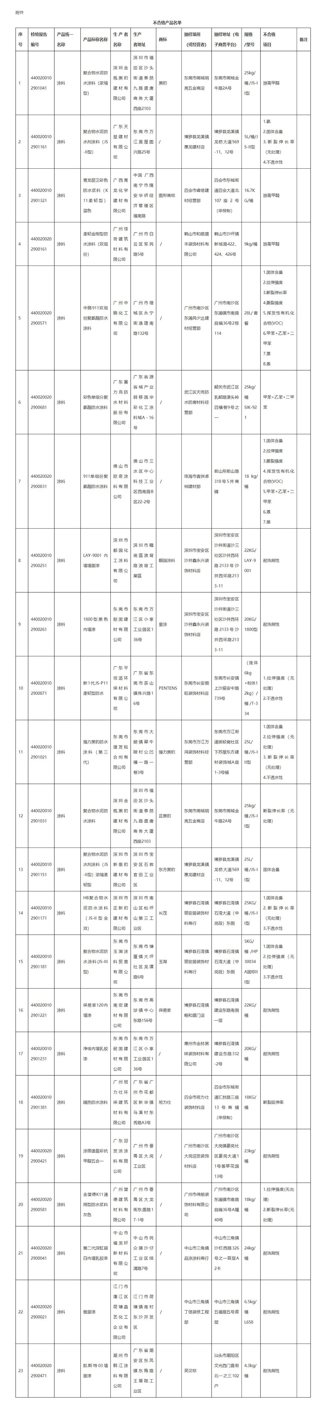 其中,深圳金瓶黑豹建材有限公司生产的聚合物水泥防水涂料(浓缩型)、广西青龙化学建材有限公司生产的青龙厨卫彩色防水浆料(K11柔韧型)蓝色、广州佳帝建筑材料有限公司生产的柔韧金刚型防水涂料(双组份)游离甲醛超标,广州中鹏化工有限公司生产的中鹏911双组份聚氨酯防水涂料、佛山市欧奇涂料有限公司生产的911单组份聚氨酯防水涂料涉及挥发性有机化合物(VOC)及甲苯+乙苯+二甲苯超标,广东赛力克防水材料股份有限公司生产的彩色单组分聚氨酯防水涂料甲苯+乙苯+二甲苯超标。