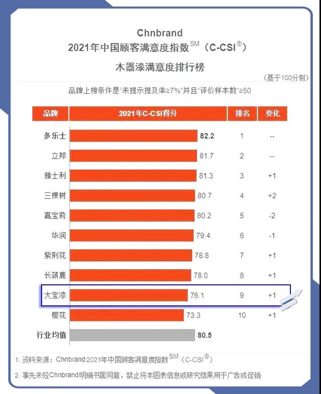 7月20日,品牌评级权威机构Chnbrand发布2021年度(第七届)中国顾客满意度指数(C-CSI)品牌排名及分析报告。大宝墙面漆与木器漆分别以第七、第九的优异排名入围榜单,其中墙面漆较去年排名上升了2位,木器漆较去年上升了1位。
