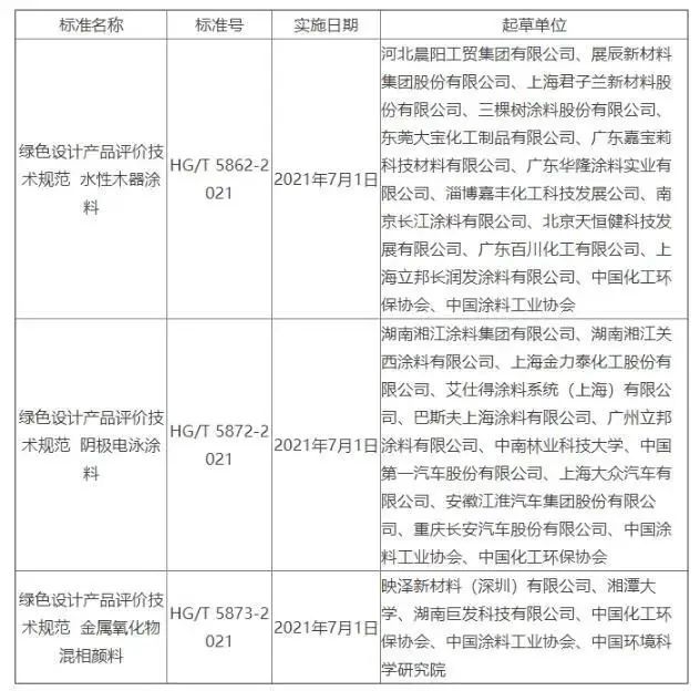 4月19日,工信部发布了《中华人民共和国工业和信息化部公告(2021年第6号》,批准发布了《工业互联网平台应用管理接口要求》等563项行业标准。其中,《绿色设计产品评价技术规范 水性木器涂料》、《绿色设计产品评价技术规范 阴极电泳涂料》以及《绿色设计产品评价技术规范 金属氧化物混相颜料》三项标准均为2021年7月1日。