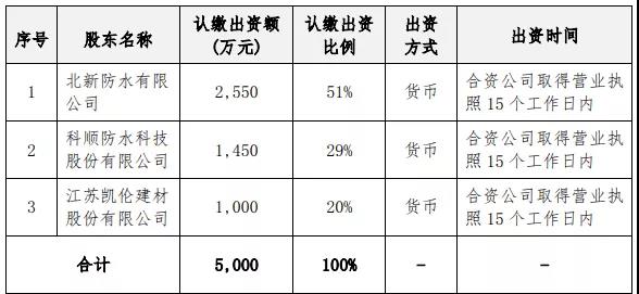 出资方式为:北新防水以货币方式出资2550万元,出资比例为51%,资金来源为自有资金;科顺股份以货币方式出资1450万元,出资比例为29%,资金来源为自有资金;凯伦股份以货币方式出资1000万元,出资比例为20%,资金来源为自有资金。