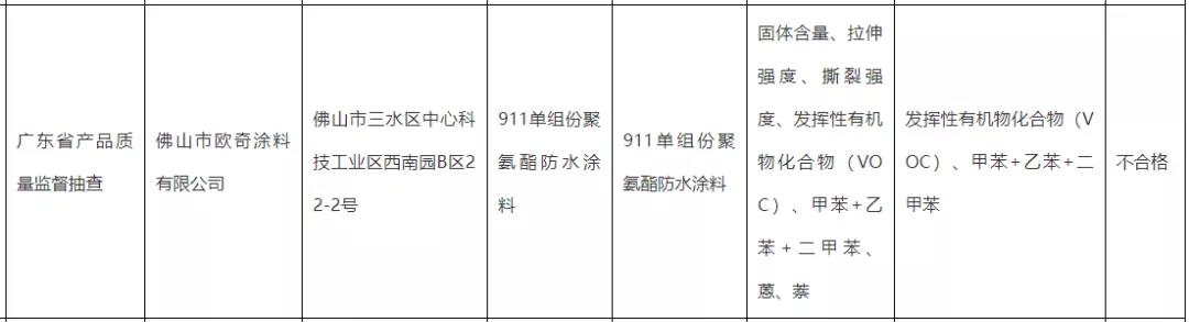 其中佛山市欧奇涂料有限公司的911单组份聚氨酯防水涂料在首次抽查中发现固体含量、拉伸强度、撕裂强度、发挥性有机物化合物(VOC)、甲苯+乙苯+二甲苯、蒽、萘等指标不合格,在复查中又发现含有发挥性有机物化合物(VOC)、甲苯+乙苯+二甲苯。