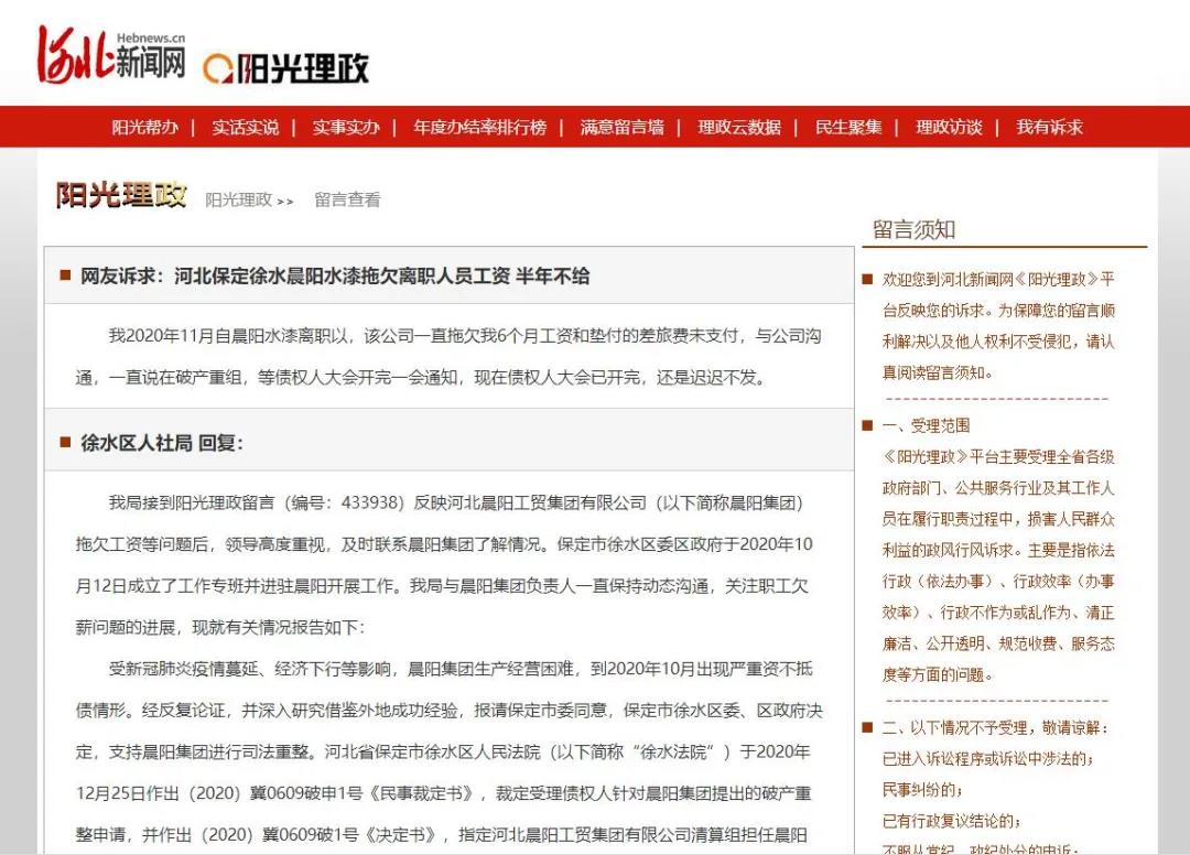 6月17日,有网友在河北新闻网阳光理政平台留言问道:“我2020年11月自晨阳水漆离职,该公司一直拖欠我6个月工资和垫付的差旅费未支付,与公司沟通,一直说在破产重组,等债权人大会开完以后会通知,现在债权人大会已开完,还是迟迟不发。”