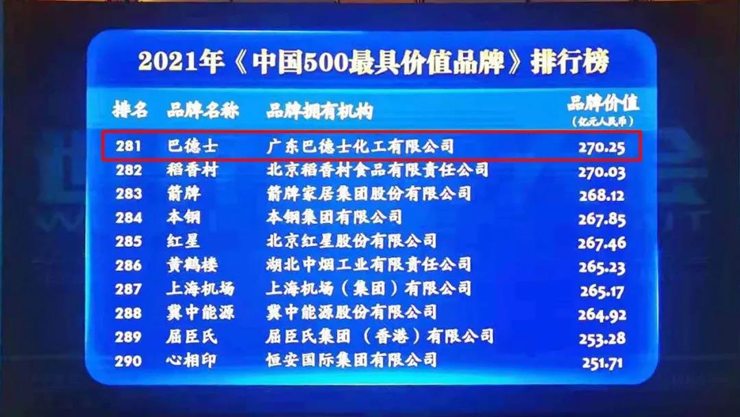 巴德士获颁《中国500最具价值品牌》证书(图源:巴德士集团微信公众平台)