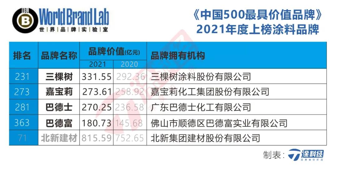 此外,包括美涂士(1次)、华润漆(2次)、吉人牌(5次)、冠军漆(1次)和嘉丽士(3次)等涂料品牌也曾登上《中国500最具价值品牌》榜单,但最近两年不再入围,原因不详。