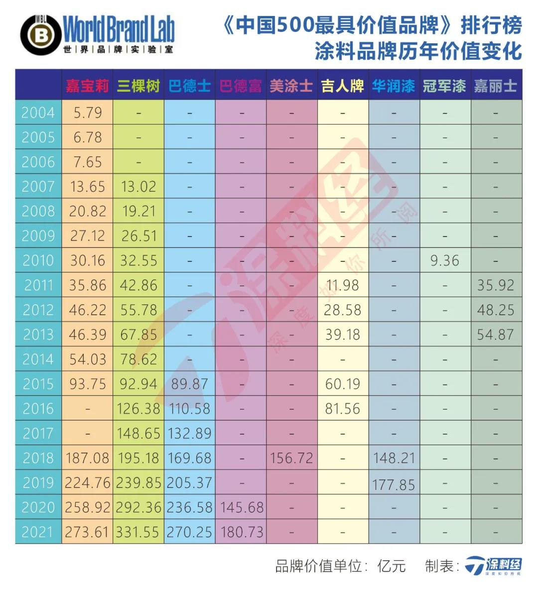 根据《涂料经》所整理的《中国500最具价值品牌》排行榜涂料品牌历年价值(2004年-2021年)变化表格来看,有9个涂料品牌(含巴德富)都进过该榜单——