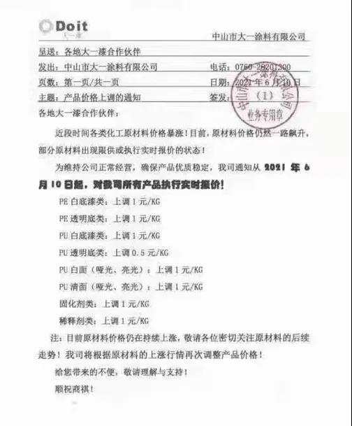 6月10日,中山市大一涂料有限公司决定自6月10日起,对所有产品执行实时报价,价格统一上调1元/kg。