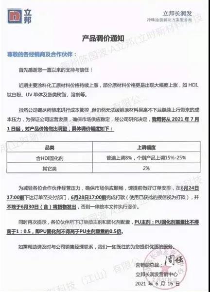 6月16日,立邦长润发布涨价函表示,自7月1日起,含HDI固化剂普遍上调8%,个别产品上调15%-25%,其它类上调2%。